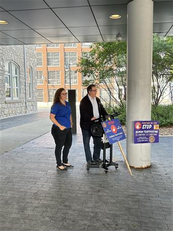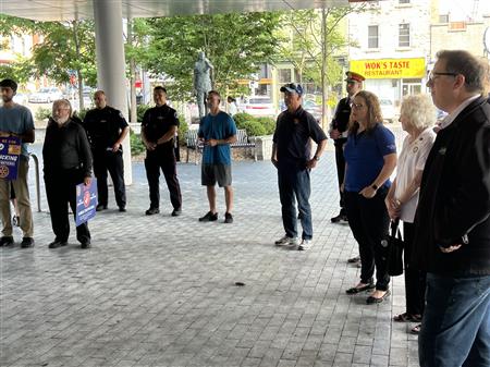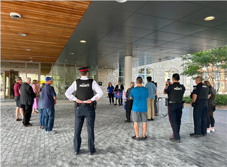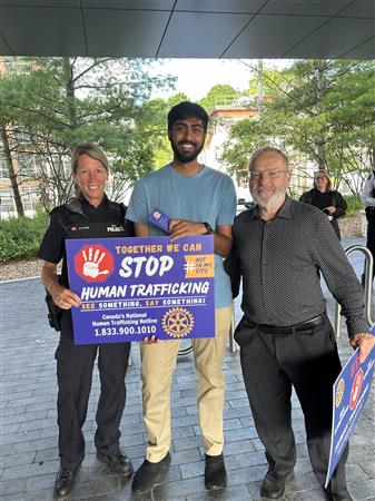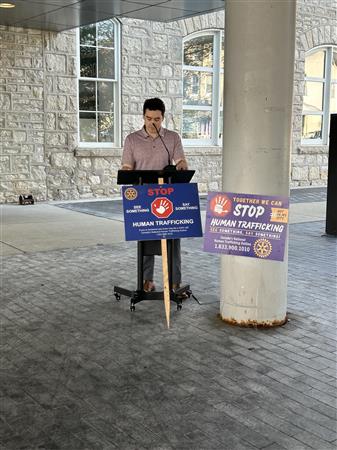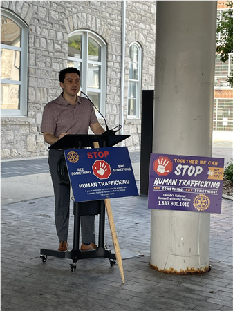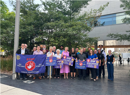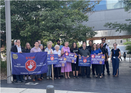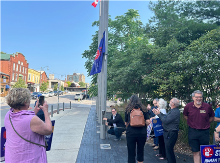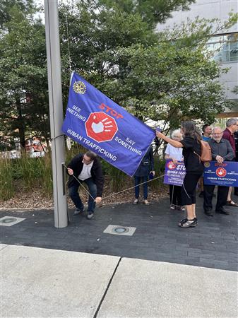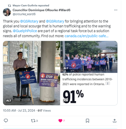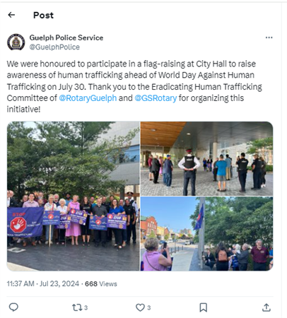 On July 23 2024 a group marched from St. George's Square in downtown Guelph, carrying the "Stop Human Trafficking" lawn signs, to Guelph City Hall. Accompanied by representatives of the Guelph Police Service, Guelph Ward 6 Councilor Dominique O'Rourke and Guelph Mayor Cam Guthrie, the "Stop Human Trafficking" flag was hoisted on one of the flag poles outside of Guelph City Hall. July 30th of every year is "World Day Against Trafficking in Persons".