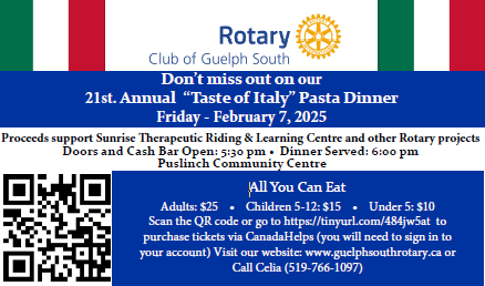 This 21st annual fundraiser, and much-loved Puslinch community fellowship event, was held on Friday February 7 2025 at the Puslinch Community Centre. This event primarily benefits Sunrise Therapeutic Riding & Learning Centre, along with other worthwhile Rotary-supported projects.