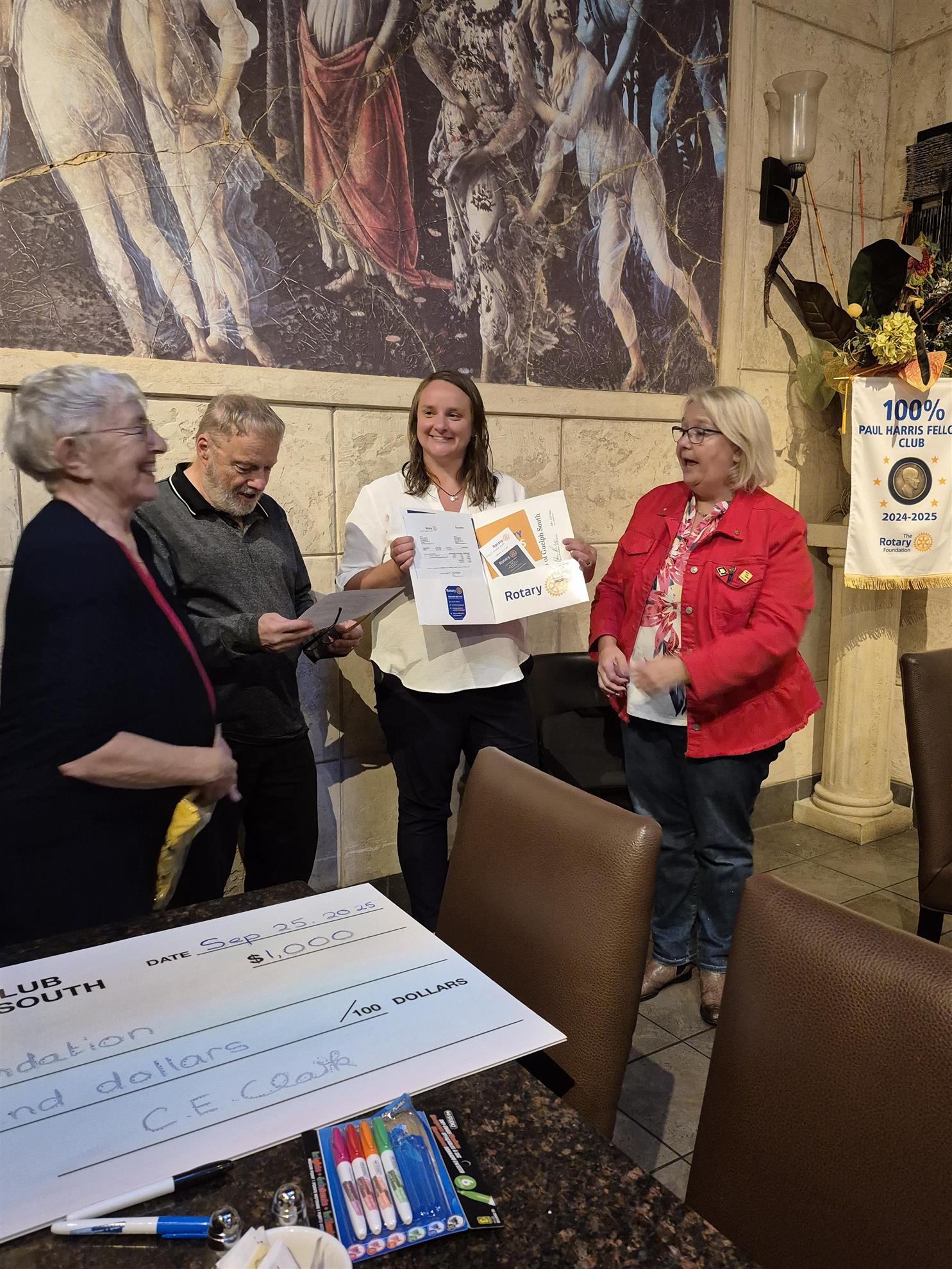 The 2025-2026 District 7080 Governor, Susanne Zbinden, made her first official visit to our Rotary club on September 25th 2025. The in-person meeting, held in the evening at Symposium Cafe in Guelph, featured presentations by the DG, the club and a special new member (Lauren Jamieson) induction. A donation of $1,000 is being made to The Rotary Foundation's PolioPlus Fund in appreciation of her visit. As well a photo album has been prepared photoalbums/2025-district-7080-governor-visit. Attendees included members, Friends of Rotary and a member of the University of Guelph Rotaract Club.